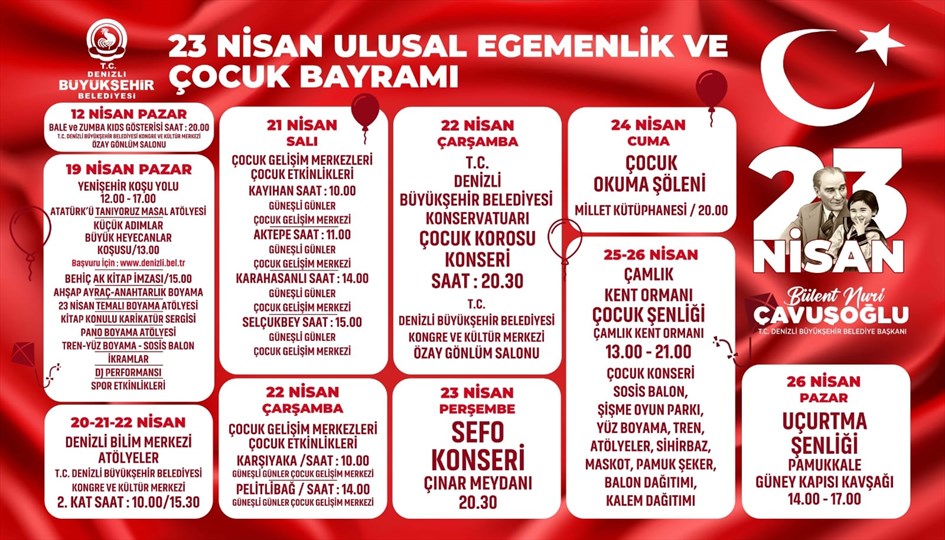 Bu yıl 106.’sı kutlanacak 23 Nisan Ulusal Egemenlik ve Çocuk Bayramı’nda Denizli Büyükşehir Belediyesi yine dopdolu bir program hazırladı. Kutlamalar, 12 Nisan’da sahnelenen Bale ve Zumba Kids gösterisiyle başladı. 19 Nisan 12.00-17.00 saatleri arasında Yenişehir Koşu Yolu’nda düzenlenecek etkinliklerde ise programlarla çocuklar hem eğlenecek hem de öğrenecek. “Atatürk’ü Tanıyoruz” masal atölyesinden çocuk koşularına, kitap imza gününden çeşitli boyama atölyelerine kadar pek çok aktivite miniklerle buluşacak.