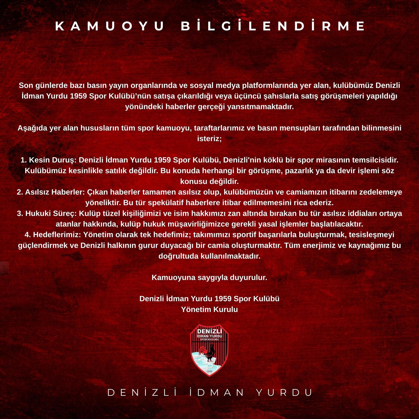 Kulüp tarafından yapılan açıklamada, Denizli İdman Yurdu 1959’un Denizli’nin köklü spor mirasının önemli temsilcilerinden biri olduğu belirtilerek, kulübün kesinlikle satılık olmadığı ifade edildi. Yönetim, kulübün devri, satışı ya da bu yönde herhangi bir pazarlık sürecinin bulunmadığını net bir şekilde dile getirdi.
