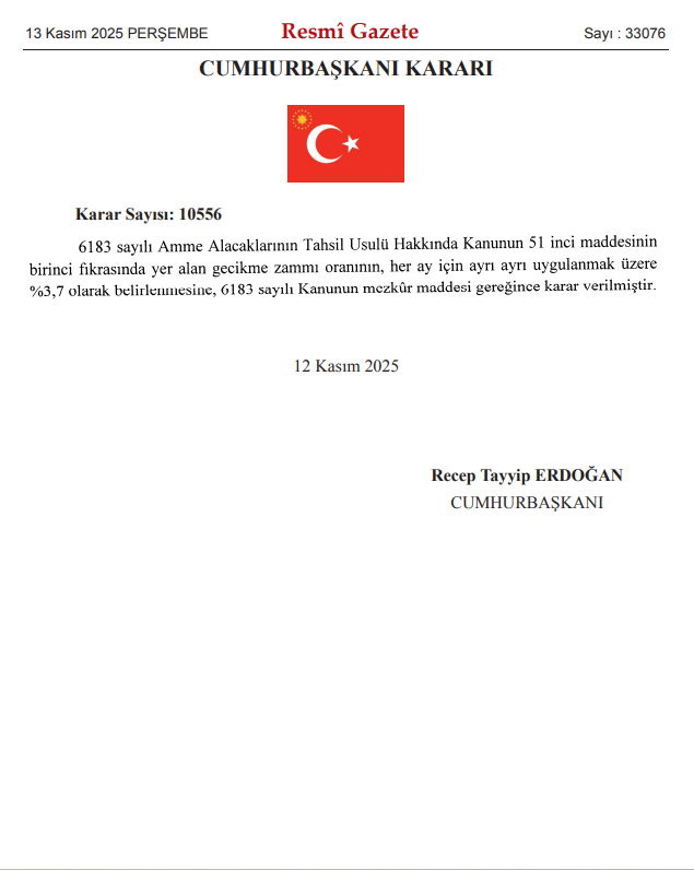 Resmi Gazete’de yayımlanan Cumhurbaşkanı kararında şu ifadelere yer verildi:“6183 sayılı Amme Alacaklarının Tahsil Usulü Hakkında Kanunun 51’inci maddesinin birinci fıkrasında yer alan gecikme zammı oranının, her ay için ayrı ayrı uygulanmak üzere yüzde 3,7 olarak belirlenmesine, 6183 sayılı Kanunun mezkür maddesi gereğince karar verilmiştir.”