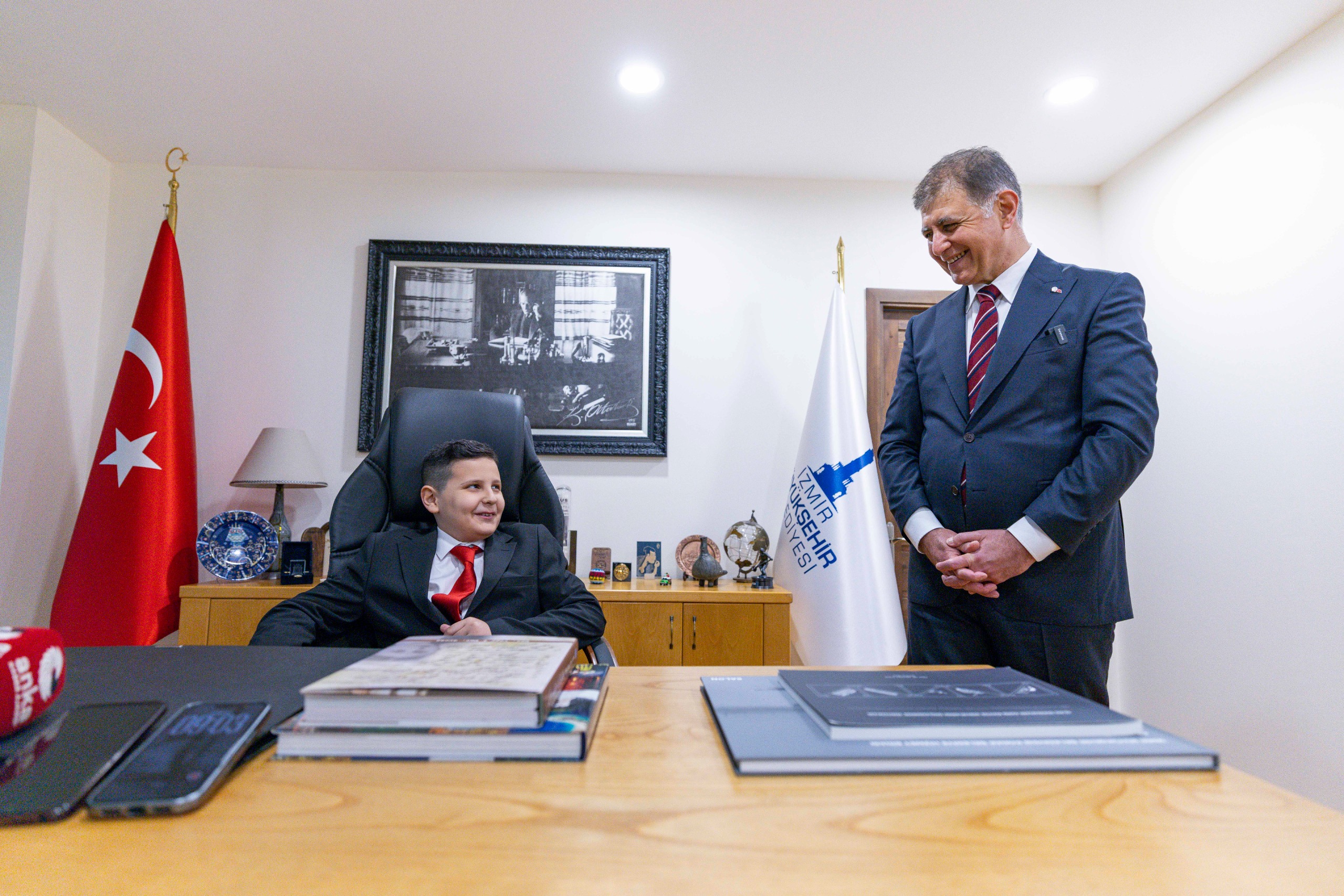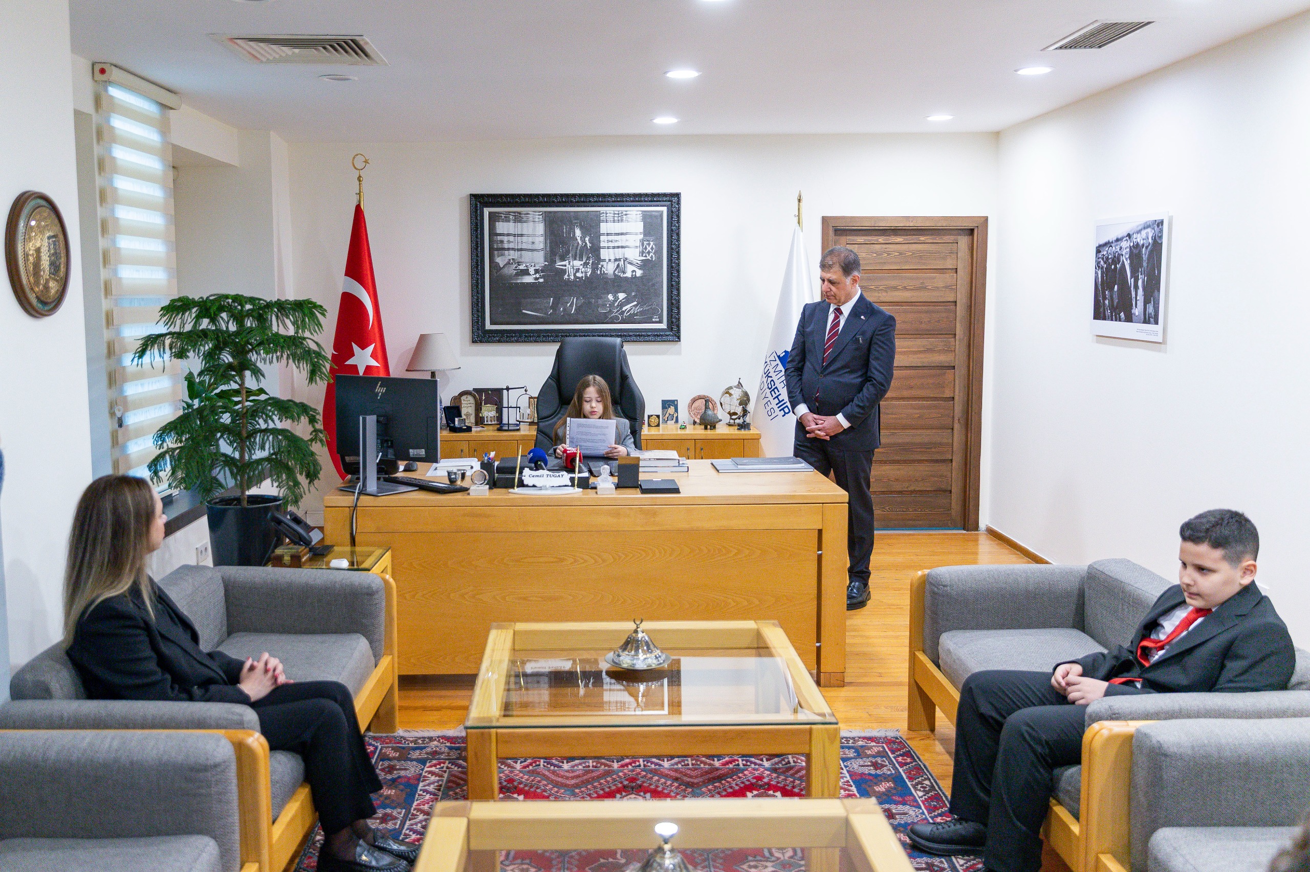 İzmir Büyükşehir Belediye Başkanı Dr. Cemil Tugay, Ulu Önder Gazi Mustafa Kemal Atatürk’ün dünya çocuklarına armağan ettiği 23 Nisan Ulusal Egemenlik ve Çocuk Bayramı’nda koltuğunu İzmir Çocuk Meclisi Sosyal Etkinlikler Planlama Komisyonu üyesi Selçuk Yaşar Alaybey Ortaokulu 5. sınıf öğrencisi Meryem Günay ve Buca 30 Ağustos İlkokulu 4. Sınıf öğrencisi Aras İpek’e devretti.