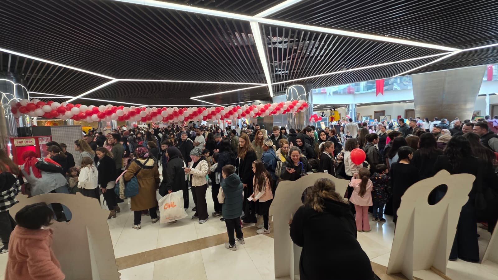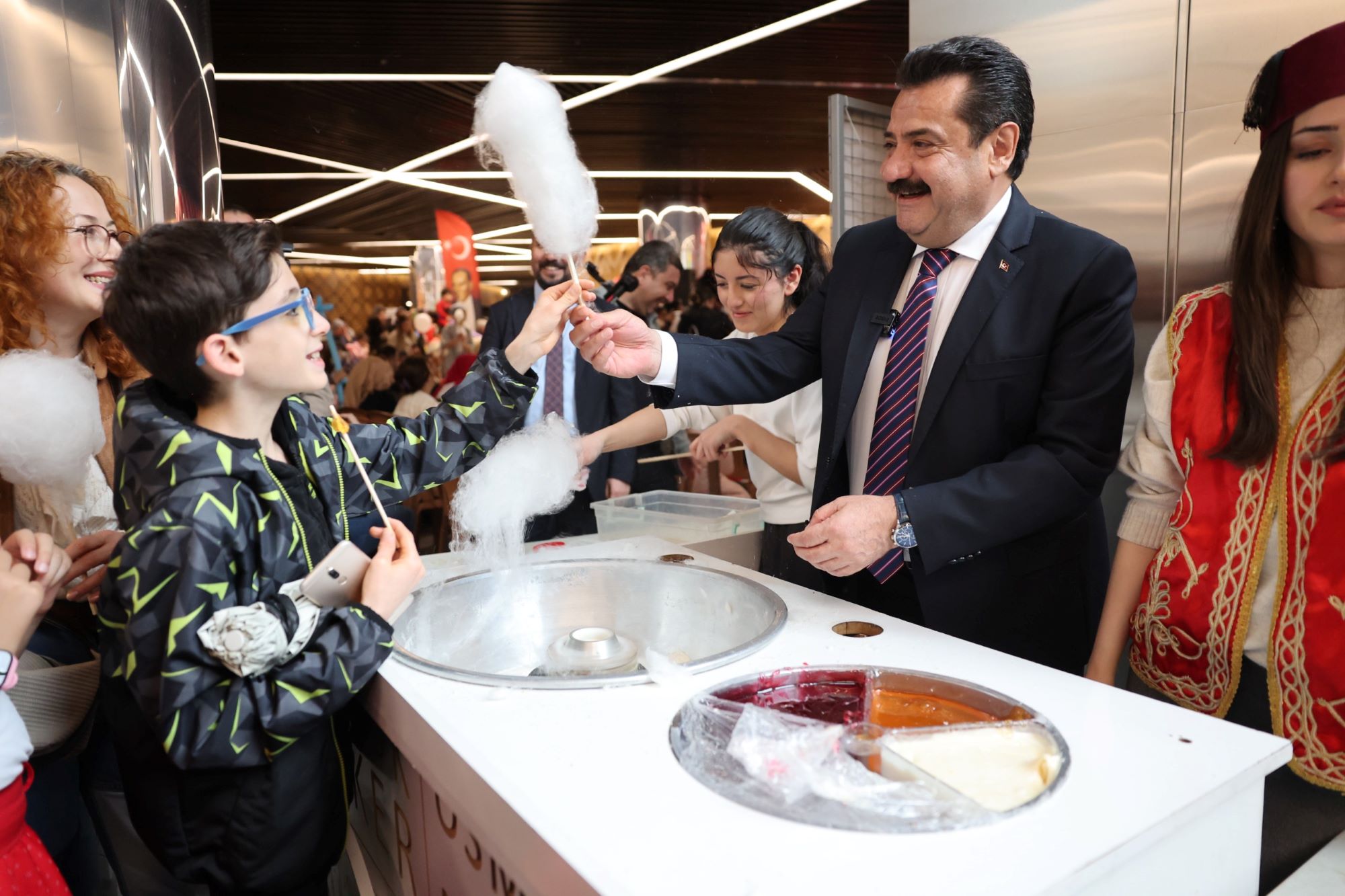 Alanı dolduran binlerce çocuğa dağıtılan Türk bayrakları ve renkli balonlar, merkezi adeta kırmızı-beyaz bir görsel şölene çevirerek bayram ruhunu doruğa çıkardı. Bu coşkuya eşlik eden taze pamuk şeker, popcorn ve geleneksel Osmanlı macunu gibi ücretsiz ikramlar ise minik misafirlerin bayram sevincine tatlı bir dokunuş kattı.