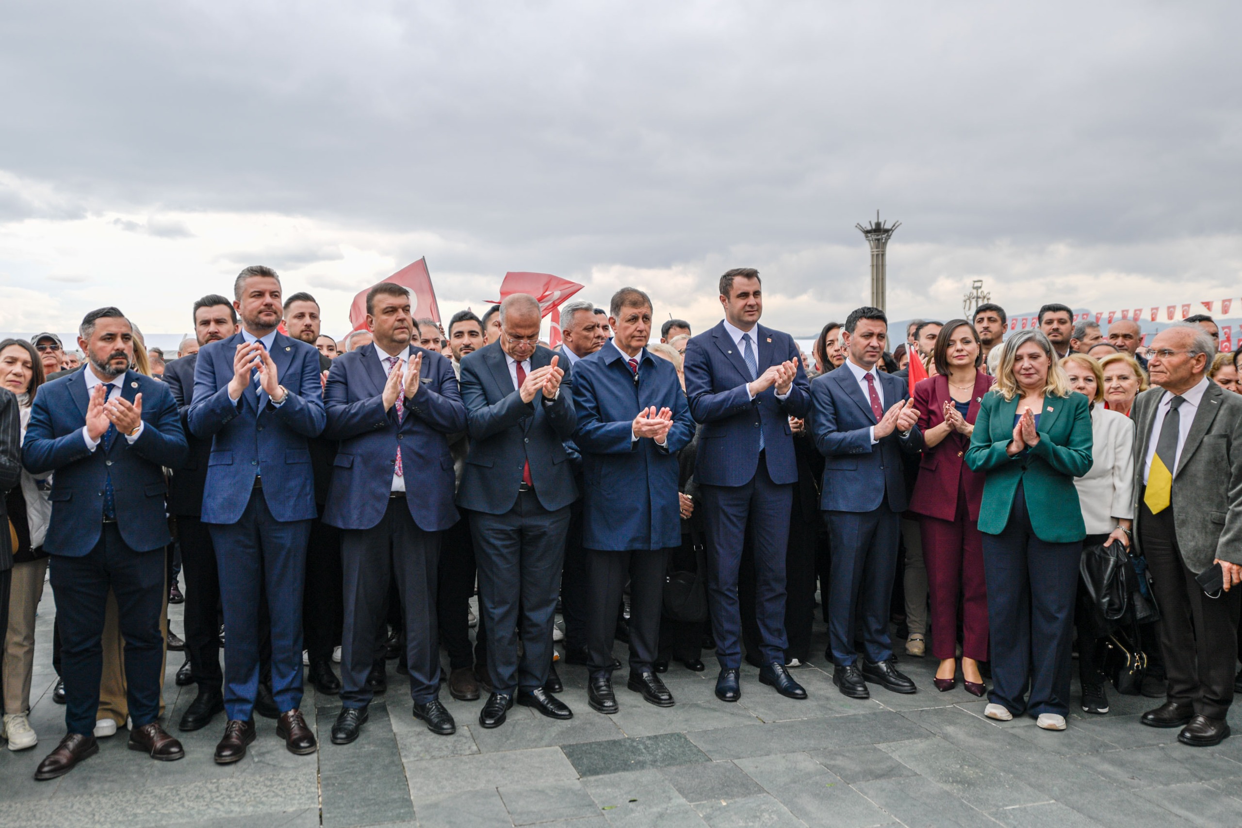 Meydandaki Atatürk Anıtı’na çelenk; Çağatay Güç, CHP İzmir Kadınlar Kolları Başkanı Zahide Kurun ve CHP İzmir Gençlik Kolları Başkanı Ruhsar Selis Çelik Kınacı tarafından sunuldu.Saygı duruşu ve İstiklal Marşı’nın ardından, Kahramanmaraş’ta meydana gelen okul saldırısında hayatını kaybedenler için sessiz yürüyüş düzenlendi.