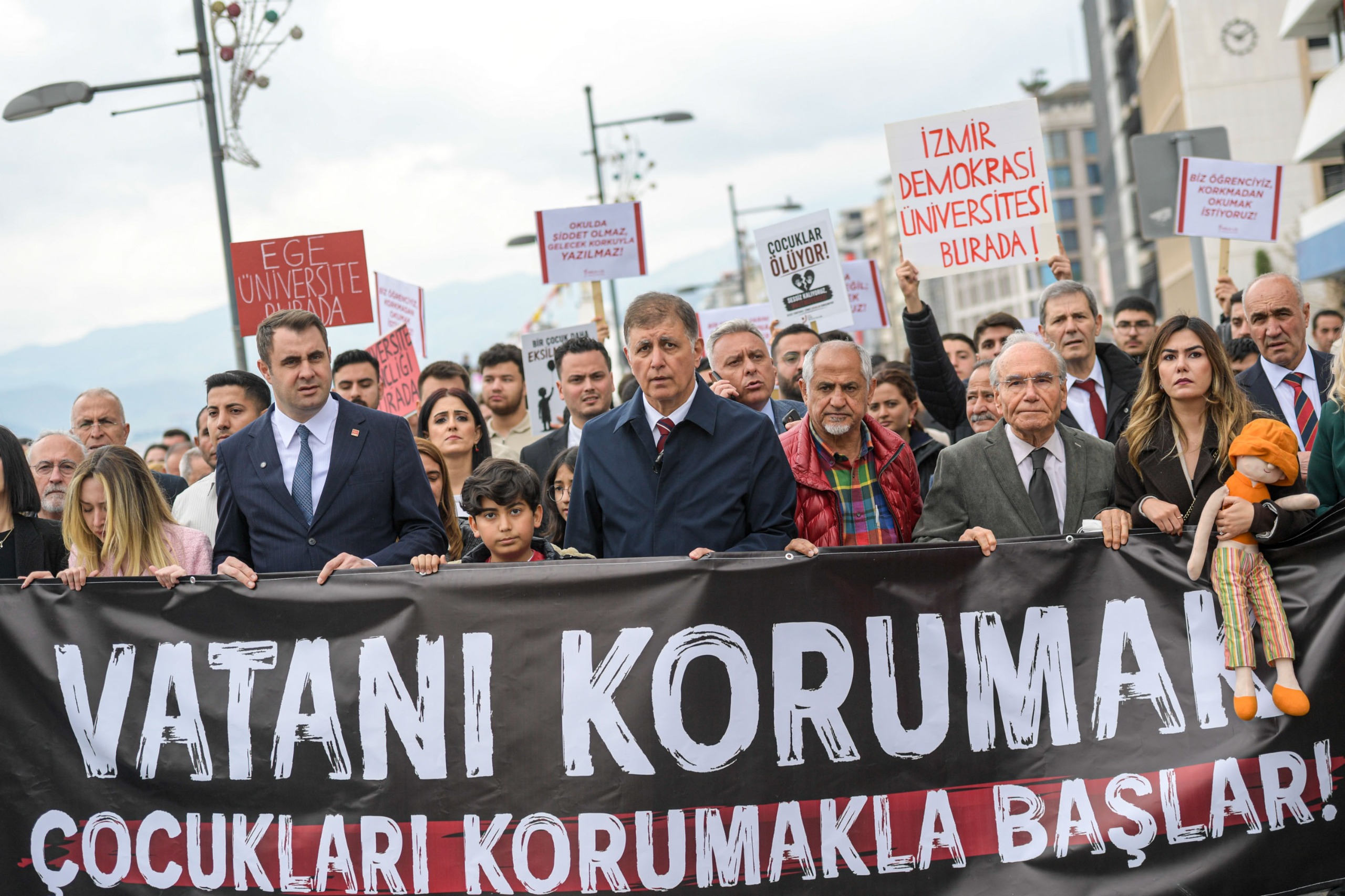 Başkan Tugay’ın da katıldığı yürüyüşte, “Vatanı korumak, çocukları korumakla başlar” yazılı pankart taşıyan partililer İzmir İl Milli Eğitim Müdürlüğü’ne kadar yürüdü.