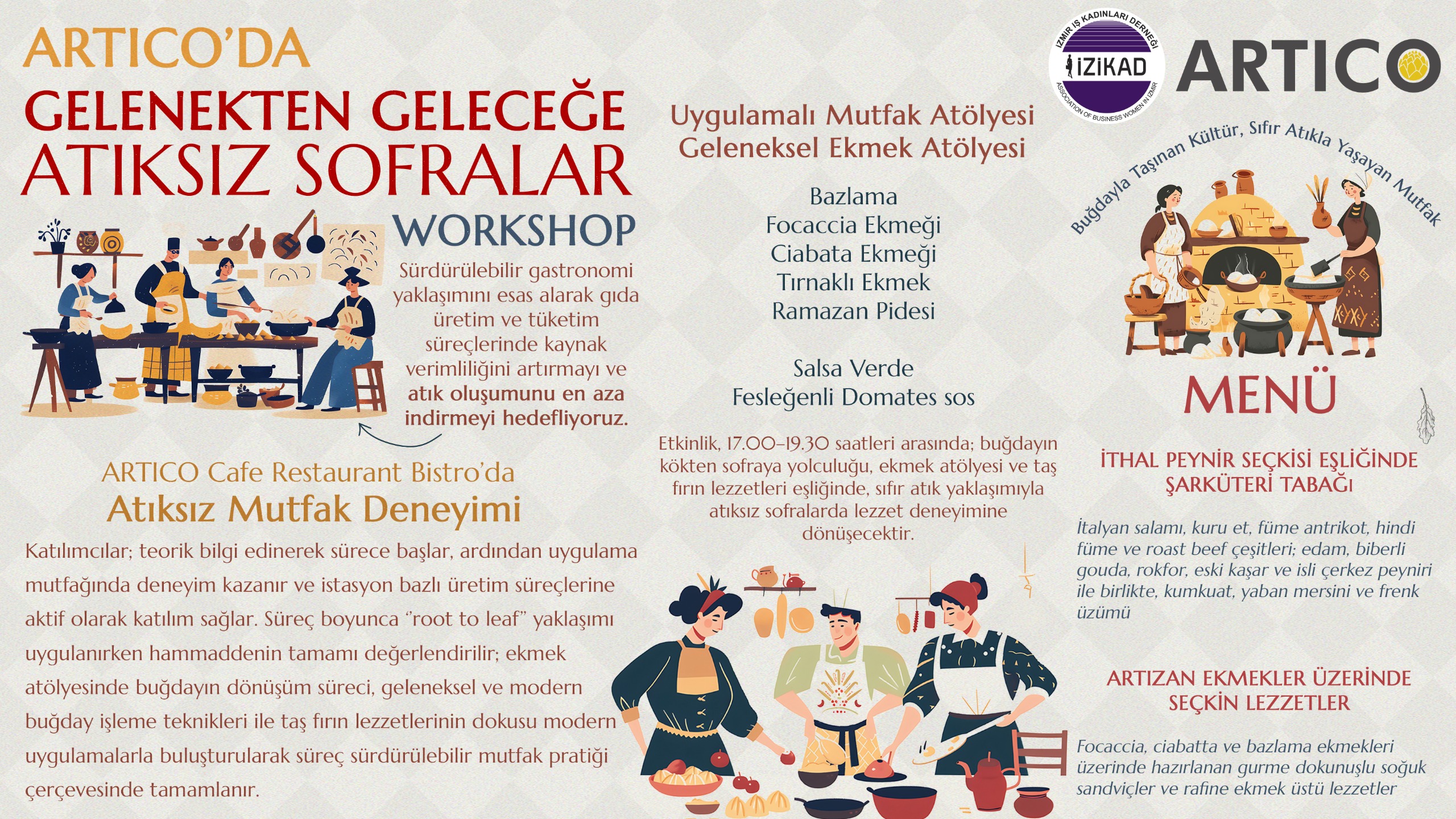 İzmir İş Kadınları Derneği (İZİKAD), toplumsal ve ekoloji temelli sürdürülebilirlik hedefleri doğrultusunda yürüttüğü çalışmalarına bir yenisini daha ekledi. Enginar Catering desteği ile ARTICO Restoran’da hayata geçirilen Gelenekten Geleceğe Atıksız Sofralar Workshop etkinliğinde, gastronomi dünyasında giderek önem kazanan sıfır atık yaklaşımı ele alındı. Sürdürülebilir gastronomi yaklaşımıyla kurgulanan atölyede, geleneksel üretim tekniklerinin modern mutfak disiplinleriyle nasıl harmanlanabileceği teorik ve uygulamalı olarak aktarıldı. Katılımcıların üretim süreçlerine dahil olduğu etkinlikte, geleneksel ekmek atölyesi de yapıldı.