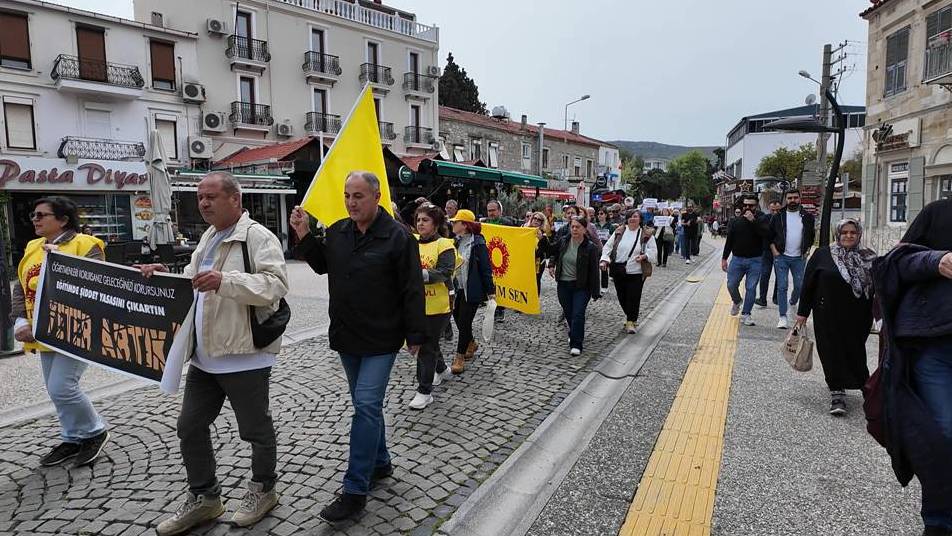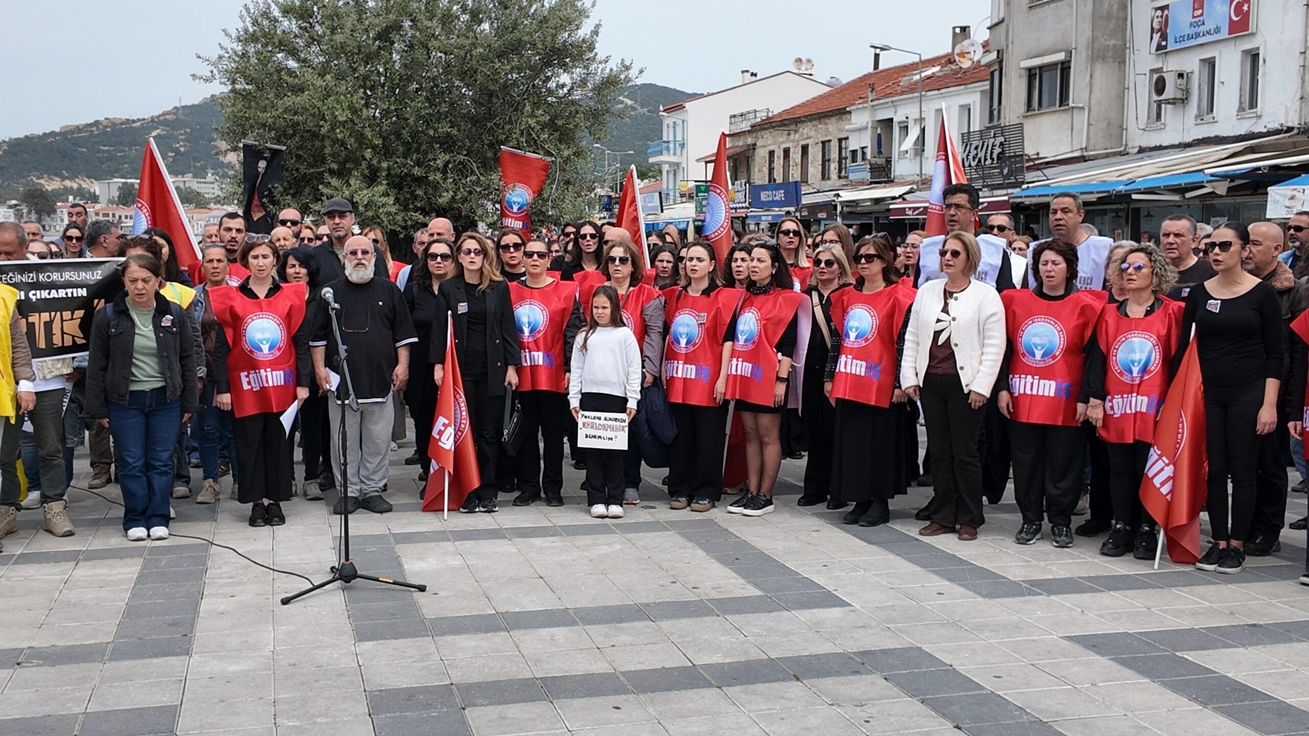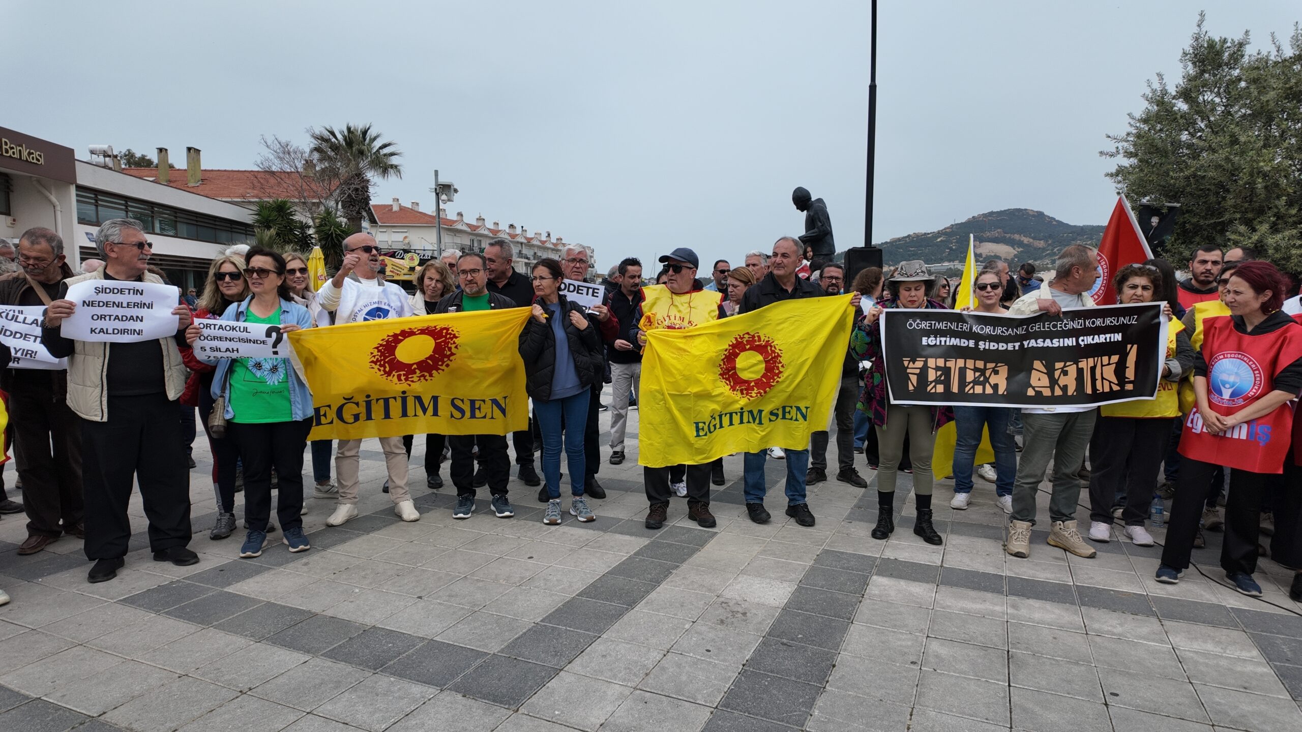 Ortak basın açıklamasını ise katılımcılar adına Eğitim İş Foça Şubesi Eğitim Sekreteri Demet Doğan okudu. Konuşmasına, “Bugün okullarımızda ders zili çalmadı; çünkü bugün yasımız, öfkemiz ve büyük bir isyanımız var. Dün ve bugün yaşanan şiddet olayları bardağı taşıran son damla olmuştur” diyerek başladı. Demet Doğan;” Biliyoruz ki; meslektaşlarımıza yönelen o silahlar, o yumruklar sadece şahısların değil, öğretmeni itibarsızlaştıran yanlış eğitim politikalarının ve güvenlik zafiyetlerinin bir sonucudur. Okullar savaş alanı değil, bilim yuvası olmalıdır. Bir anne, bir baba, çocuğunu okula gönderirken neden can güvenliğinden endişe etsin? Bir öğrenci, en güvenli olması gereken yerde neden şiddete tanıklık etsin? Okullarımızın kapıları herkese kontrolsüzce açılmış, koridorlar savunmasız bırakılmıştır. Milli Eğitim Bakanlığı, okulların fiziksel güvenliğini sağlamaktan aciz kalmış, ne yeterli güvenlik personeli tahsis etmiş ne de okulları dışarıdan gelecek tehlikelere karşı koruyabilmiştir. Unutulmasın ki; öğretmenin güvende olmadığı bir okulda, hiçbir öğrenci güvende değildir. Şiddet tesadüf değil, sistemsel bir çöküştür. Eğitimciyi hedef haline getiren, öğretmeni veli ve öğrenci karşısında savunmasız bırakan bu sistem, bugün meyvelerini kan ve gözyaşıyla vermektedir. Öğretmenlik mesleğinin onurunu ayaklar altına alan politikalarınız, okullardaki disiplin yönetmeliklerini işlevsiz hale getirip şiddeti “hoşgörü” maskesiyle örten tavrınız, okulları kadrolu güvenlik görevlilerinden yoksun bırakıp, şiddeti okul kapısından içeri alan denetimsizliğiniz, bugün yaşanan bu vahşetin asıl sorumlusudur. Bakanlık, sadece istatistik tutmakla yetinmeyip, hem öğretmenin hem de öğrencinin yaşam hakkını savunmak zorundadır. Bugün iş bırakıyoruz, Geleceğimizi savunuyoruz. Bizler bugün iş bırakırken sadece kendi canımızı değil; çocuklarımızın huzurla ders dinleyebileceği, korkmadan bahçesinde oynayabileceği güvenli okul hakkını savunuyoruz. Şiddetin gölgesinde eğitim olmaz, şiddetin sıradanlaştığı bir yerde gelecek inşa edilemez.”dedi.