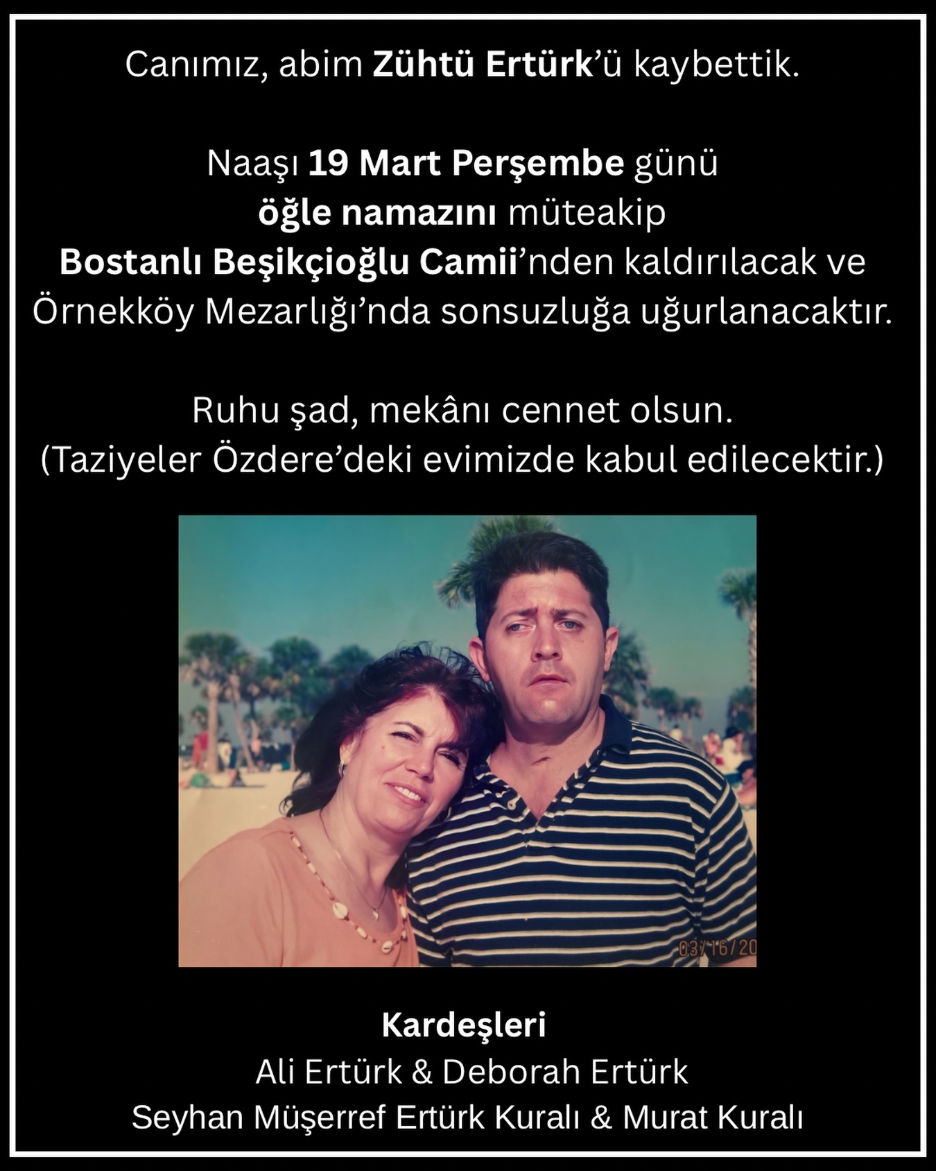 Zühtü Ertürk’ün cenazesi 19 Mart Perşembe günü öğle namazını müteakip Bostanlı Beşikçioğlu Camii’nden kaldırılarak Örnekköy Mezarlığı’nda defnedilecek.