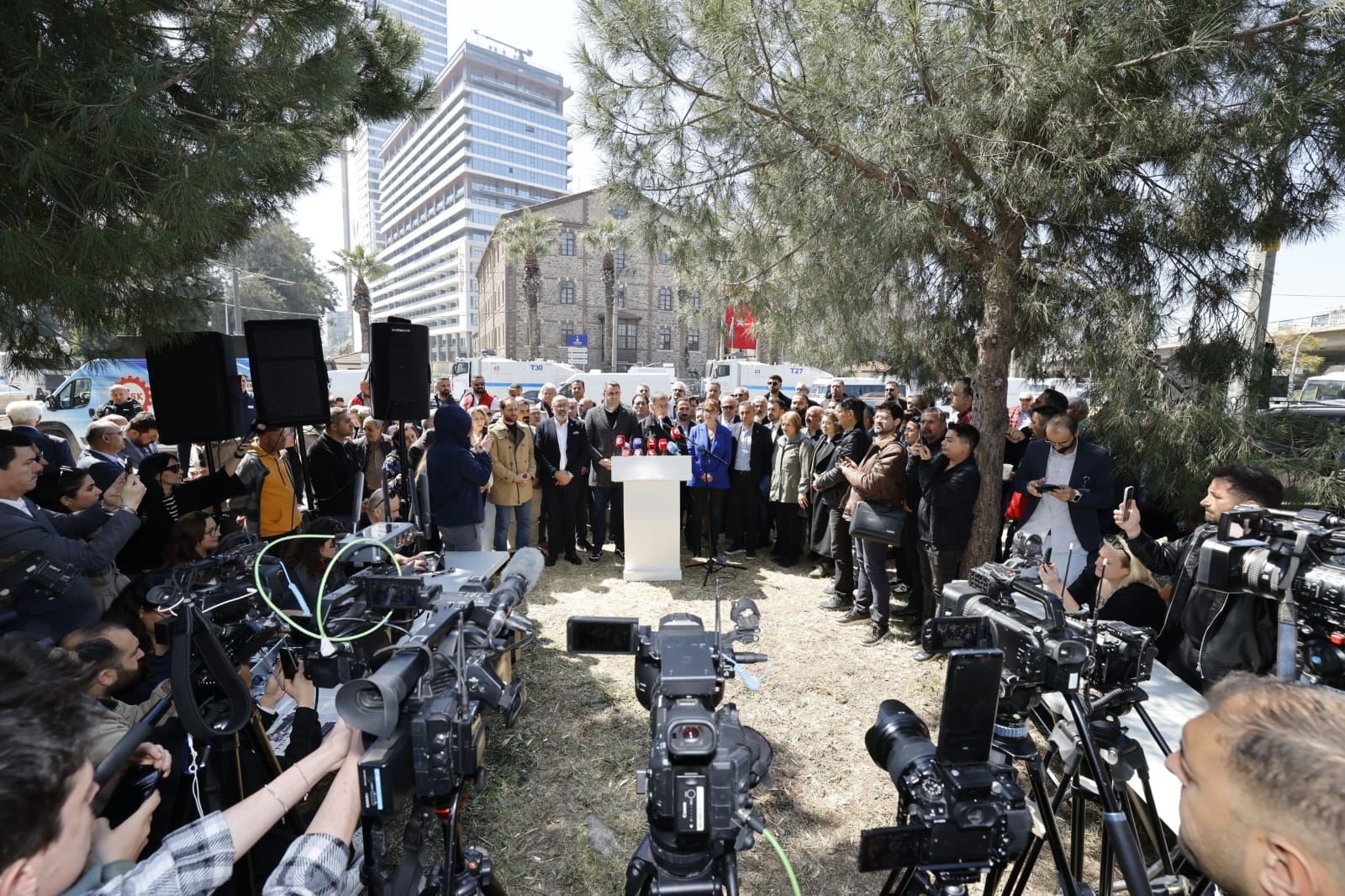 Atatürk’ün İzmir’e miras bıraktığı, tapusu Büyükşehir Belediyesi’ne ait olan, haksız şekilde el konulan binaya sahip çıkmak için herkesi desteğe çağıran Başkan Tugay, “Dün gece arkadaşlarımızla sabaha kadar buradaydım; sabahın yorgunluğuyla karşınızdayım. Biraz dinlendikten sonra yine gelip, sabaha kadar burada olacağım. Sizlerle, yani gerçek dostlarla, bu şehrin gerçek sahipleriyle omuz omuza duruyoruz. Bizleri siz göreve getirdiniz. Bizim yüzümüzü döndüğümüz insanlar sizlersiniz. Biz gücümüzü sizden alıyoruz ve sizden almak zorundayız. Bugün, beni ve bize bu durumu yaşatanlara karşı mağdur olan herkesi yalnız bırakmama günüdür” şeklinde konuştu.