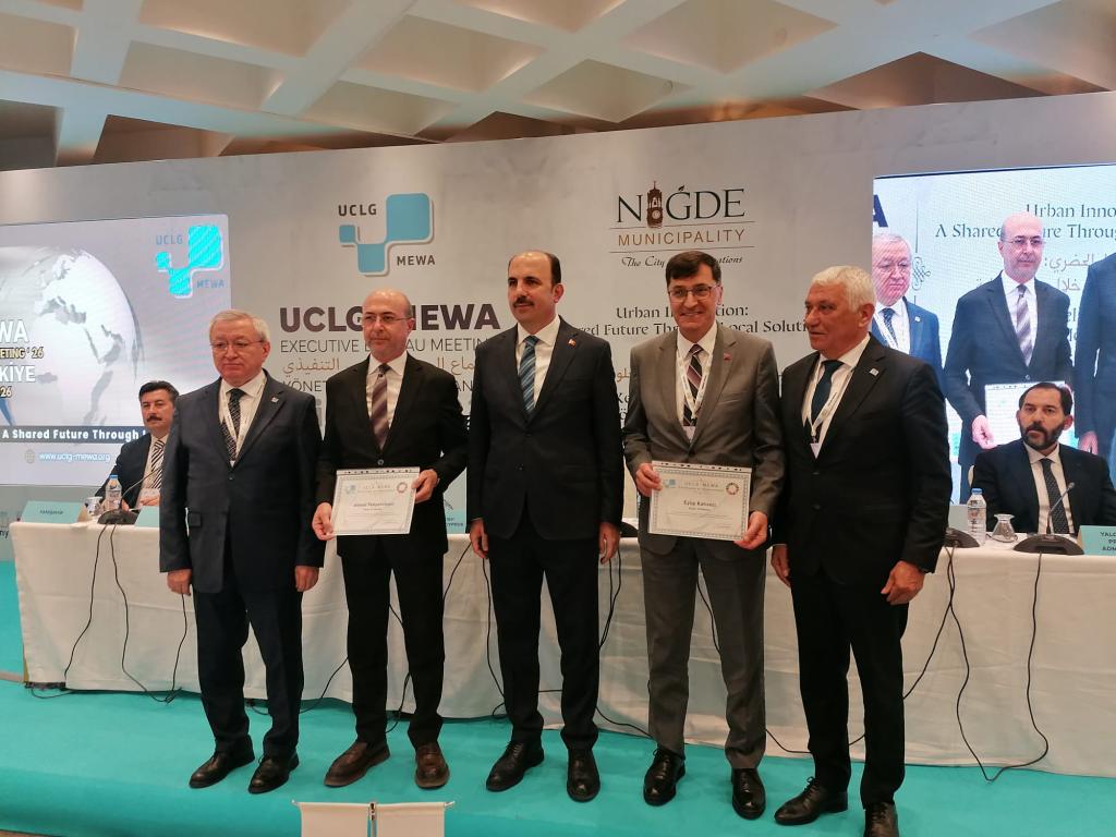 Başarı belgesi, UCLG-MEWA Yönetim Kurulu Toplantısı’nda takdim edilirken, toplantıda yerel yönetimlerin küresel hedeflerle uyumu, sürdürülebilirlik politikaları ve uluslararası iş birlikleri ele alındı.