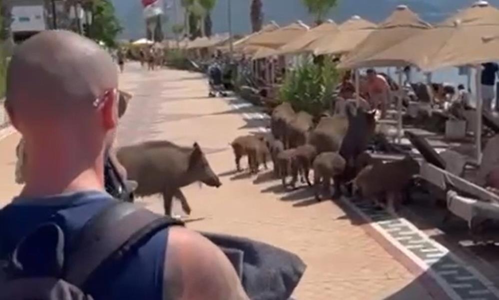 Muğla’nın gözde turizm merkezlerinden Marmaris’te, alışılmadık bir manzara yaşandı. Yaban domuzları, bu kez şehir merkezinde değil, sahilde tatilcilerin arasında ortaya çıktı. Siteler Mahallesi’nde sahile inen domuz sürüsü, çevredeki turistlerin şaşkın bakışları arasında plaj boyunca gezindi.