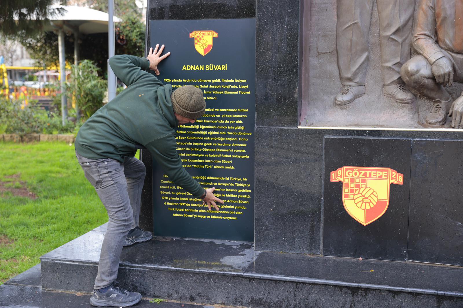 Geçtiğimiz günlerde Güzelyalı Fuat Göztepe Parkı içerisinde yer alan ve Göztepe’nin Avrupa’da yarı final oynayan efsane kadrosu ile takım antrenörü Adnan Süvari’yi simgeleyen anıta vandalist saldırı gerçekleşmişti.